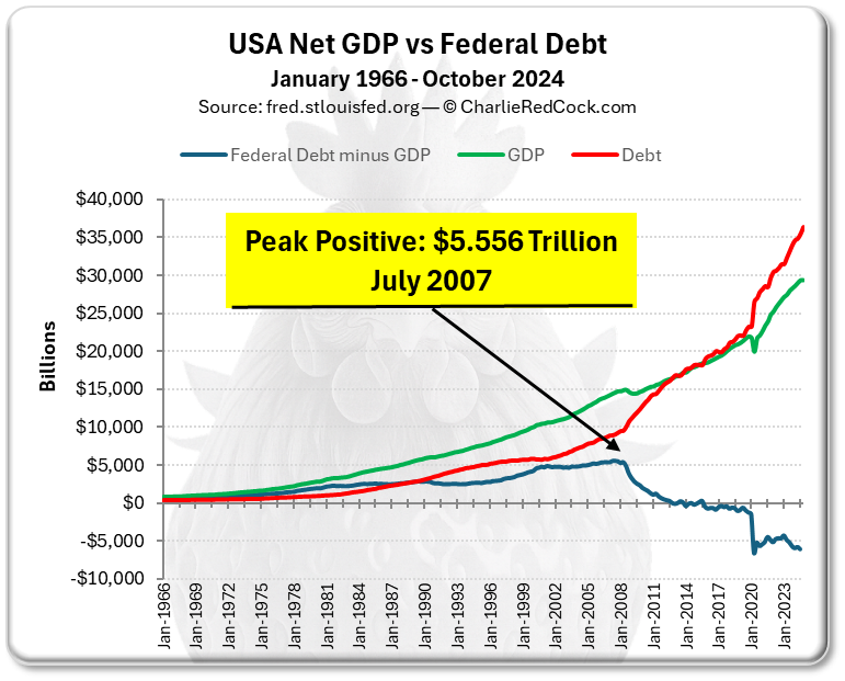 July 2007 marked the exact moment when the U.S. economy’s cumulative output (GDP) exceeded total federal debt by the widest margin in modern history: +$5.556 trillion. This wasn’t just a fiscal footnote — it was the high-water mark of national solvency. From 1966 to that point, America had produced $5.556 trillion more in GDP than it had borrowed. That surplus gap was the strongest net position the country ever held — before the tide turned and debt began outpacing growth, it was followed by a flood of stupidity.