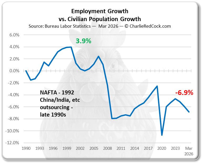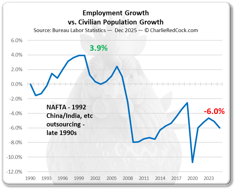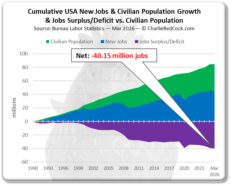 Monthly jobs reports? Oh, those are usually served à la carte—tiny portions with no sides. They focus on new jobs without asking, “Hey, did the population grow too?” This chart, however, brings the full buffet: annual and cumulative job creation, population growth, and whether we’re running a job surplus or deficit. Spoiler alert: sometimes we’re feeding more mouths with fewer paychecks.