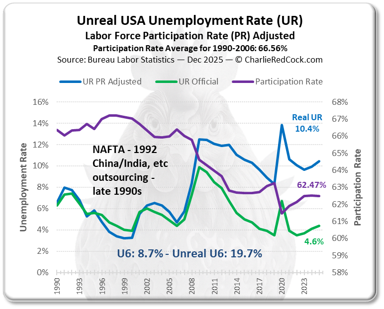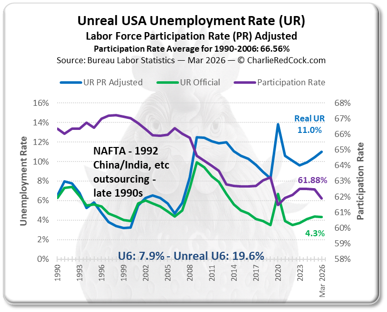 The U.S. Unemployment Rate, as published by the Bureau of Labor Statistics, is a charming little number that politely ignores the labor force participation rate—because who wants historical context when you can have selective optimism? To get the real story, you have to rewind to the pre-housing-crisis era, back when jobs were plentiful and avocado toast hadn’t yet been blamed for everything. The difference between the published rate and the real rate? That’s just the sound of people quietly exiting stage left from the labor force. And when they come back? Voilà—economic recovery!